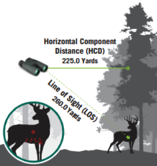 This displays the slope angle compensated distance to the target. This mode is designed to be used on level ground at any range, shooting out to 800yards with slopes less than 15 degrees and shooting out to 400yards with slopes between 15 & 30 degrees. This mode gives you the distance across the ground to the target, as this is the distance that gravity will affect the projectile.